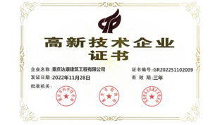 喜訊,重慶達(dá)康建筑工程有限公司順利通過(guò)重慶市科學(xué)技術(shù)局、重慶市財(cái)政局、國(guó)家稅務(wù)總局重慶市稅務(wù)局等部門的聯(lián)合評(píng)審驗(yàn)收,被正式認(rèn)定為“高新技術(shù)企業(yè)”,榮獲《高新技術(shù)企業(yè)證書(shū)》。